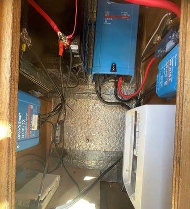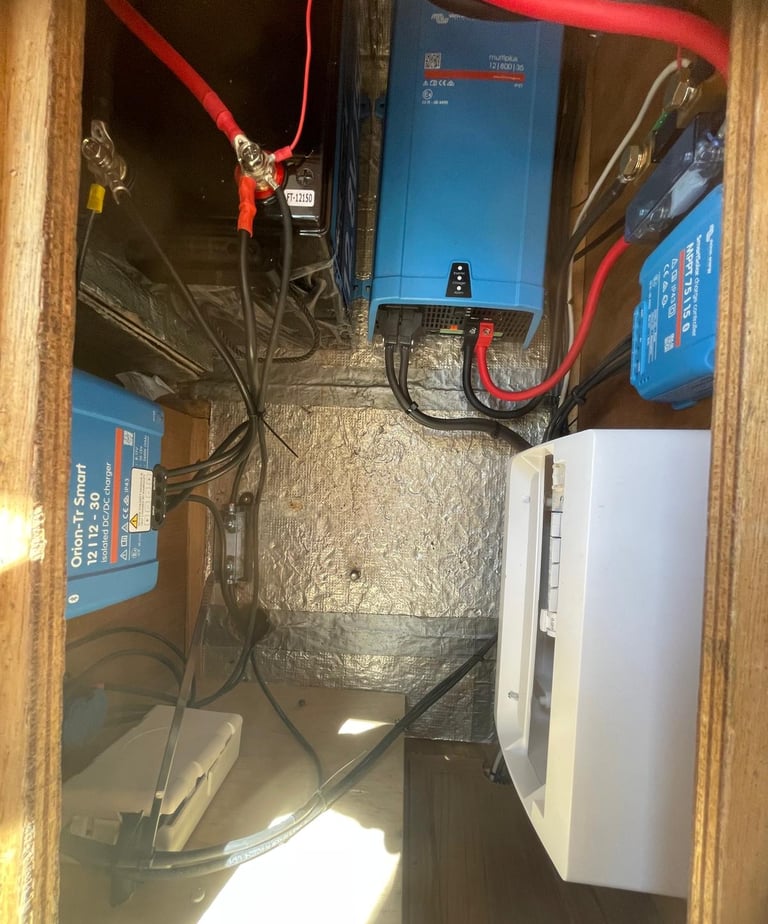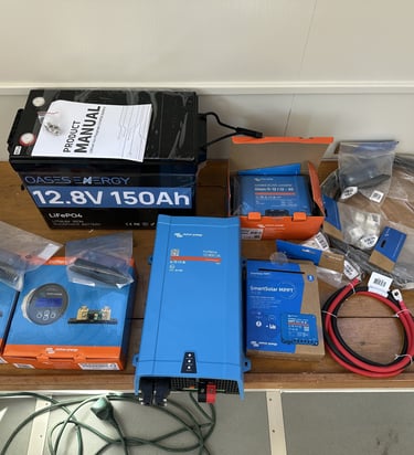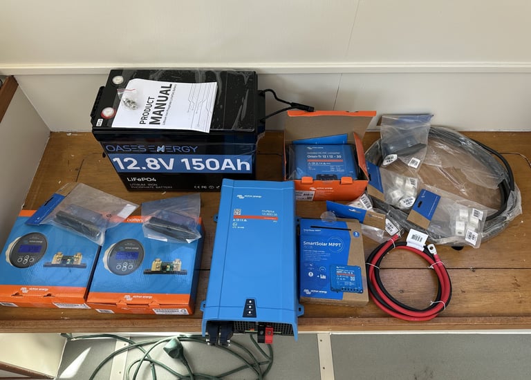 Batterie 12V, panneaux solaires, gestionnaire d'énergie.